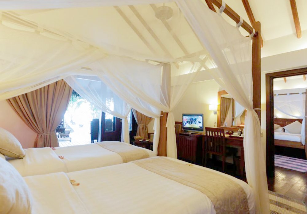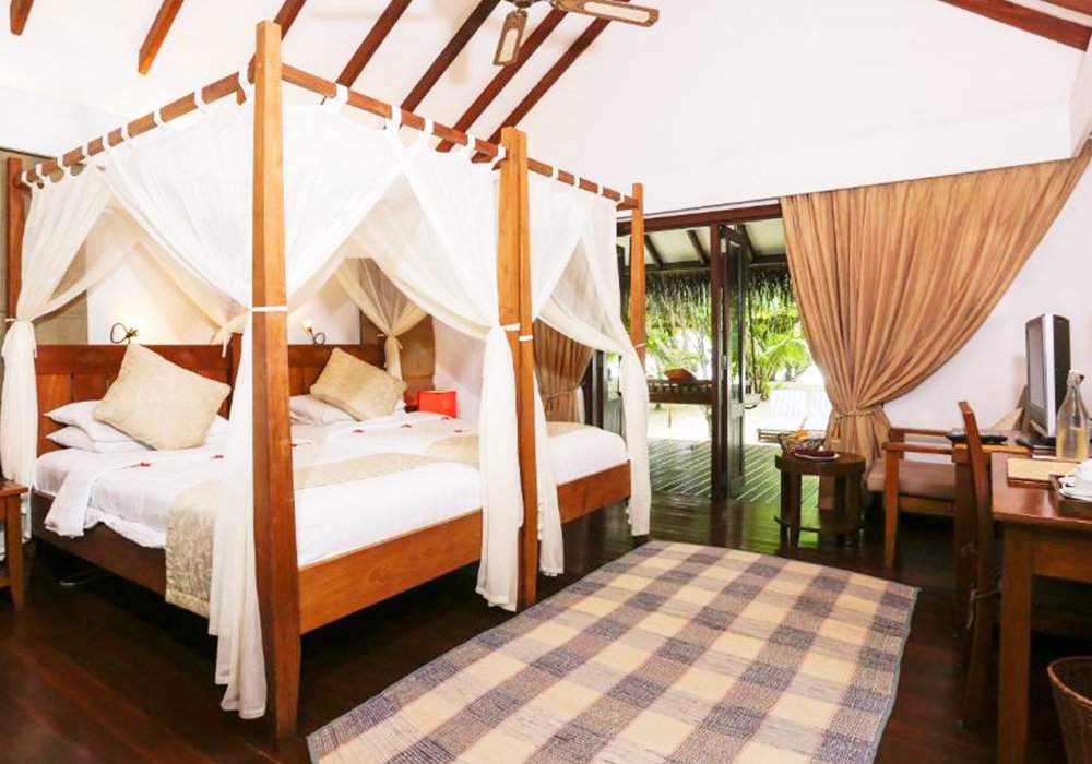 - Nestled on powdery white sand and surrounded by lush greenery like hibiscus and sea cabbage, these Beach Villas offer ultimate privacy. Each villa features a four-poster king-size bed or twin bed and an outdoor rain shower for a tropical experience. Fourteen of the Beach Villas are semi-detached, providing additional space and a partition door for a connecting option, ideal for families or friends.