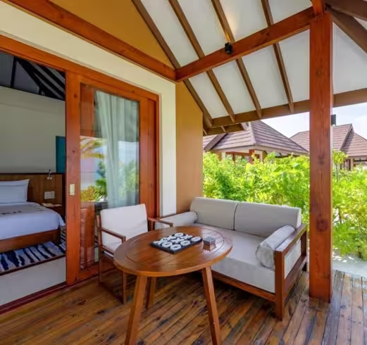 - The elegant family villa has two rooms with lovely woodwork accents and well-furnished furniture. Your children may play for hours on end at the brilliant white beach, which is just a short distance from our family-friendly homes. Up to four youngsters can stay in the Maldives villa with two bedrooms. A sizable sliding glass door opens to a wooden veranda with views of the ocean and a lush tropical garden on either side. Here, you may relax on the cozy sun loungers.