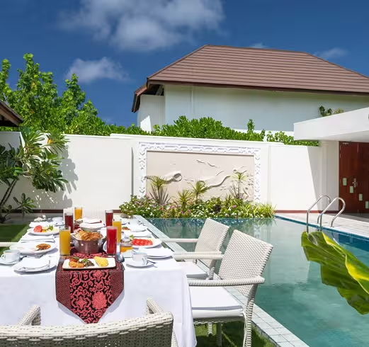 - The focal point of this chic family home in the Maldives is the 10 square meter swimming pool located on the large sundeck. For a quick pick-me-up in the morning, there is a coffee maker and a Basilur tea service nearby. The minibar and wine refrigerator are restocked twice a day with food, water, alcohol, and drinks. In this chic area, unwind, read, play board games, and spend quality time with your family.