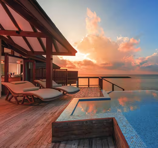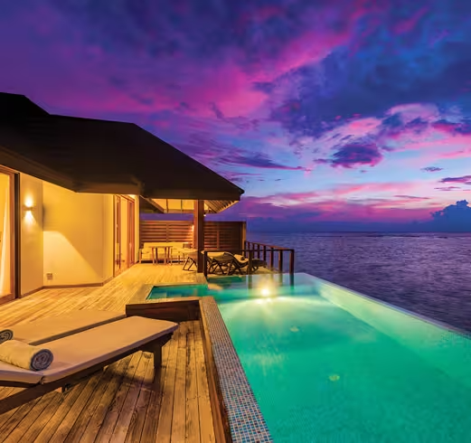 - The opulent water suite has a large living room with a pantry, a seating area with a view of the lagoon, and a master bedroom with a comfortable king-size bed. This luxurious Maldives water suite, which is situated at the end of a wooden jetty, provides unobstructed sunset views and complete seclusion for a genuinely romantic Maldives vacation. Take a seat on a cozy rattan sun lounger, go snorkeling in the lagoon, or splash around in your own 10-square-meter infinity pool.
